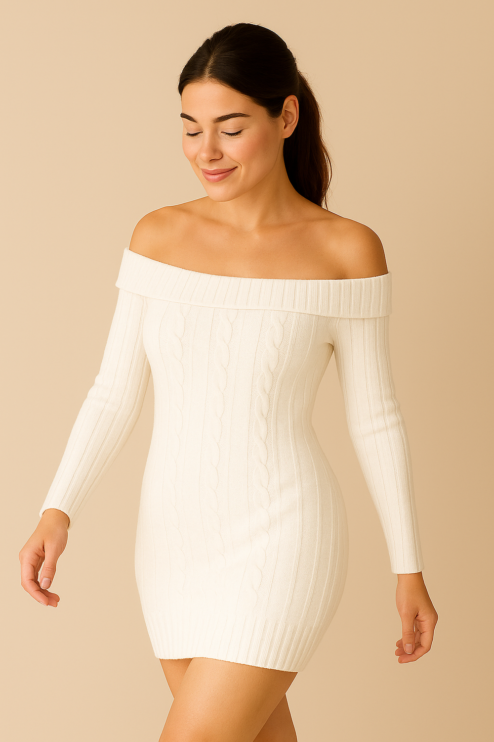Weich, warm und doch wunderbar feminin: Dieses figurbetonte Strickkleid in edlem Creme betont die Silhouette und zeigt mit seinem breiten Off-Shoulder-Kragen elegant die Schultern. Das plastische Zopfmuster und leicht ausgestellte Ärmel geben dem Look Struktur und Bewegung – perfekt für Dinner-Dates, Winter-Events oder einen kuscheligen, aber stilvollen Alltagslook.